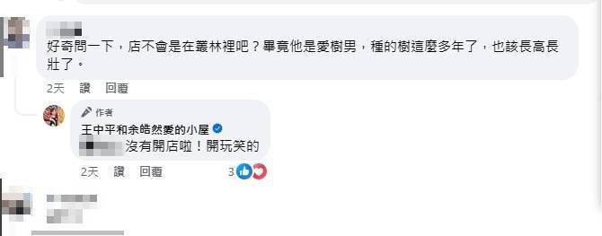 只見王中平拉著腳踏車,上面寫著「我改行當小販」,原來是兩人一起到湖口遊玩,拍下逗趣的照片,不過畫面曝光後,卻讓不少粉絲嚇喊。「真的嗎~改行」、「真假、店名」、「王中平真的有改行嗎?如果真的開始賣食物,我一定會去捧場。。。」、「好奇問一下,店不會是在叢林裡吧?畢竟他是愛樹男,種的樹這麼多年了,也該長高長壯了。」、「真的嗎好棒喔」。對此余皓然也親自回應「 沒有開店啦!開玩笑的」。