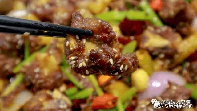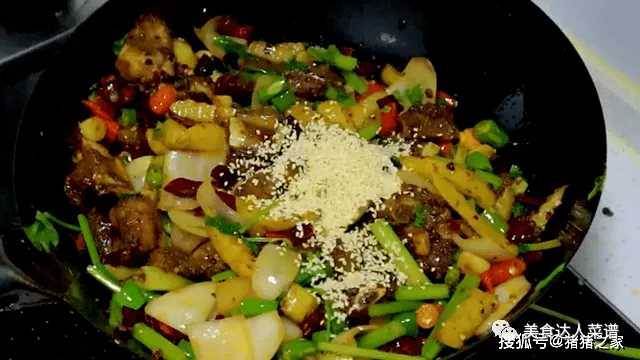 8.全部都炒香后轉成大火,倒入排骨快速炒勻后淋入一點啤酒,加啤酒不僅能讓所有調料瞬間激發出香味,更能在大火促進水氣蒸發的同時,讓排骨快速入味增香。快速炒勻后,倒入土豆、青紅椒、洋蔥和芹菜,快速翻炒入味,加鹽、白糖、味精和孜然碎調味。炒勻后鍋邊烹入陳醋增香,撒上熟芝麻,關火炒勻起鍋。