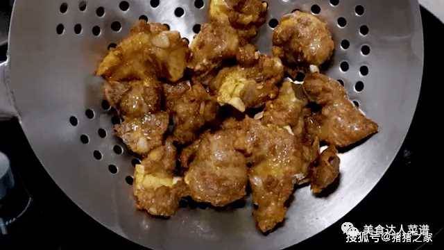 4.把鍋燒熱了倒油,我們還是遵循少倒油,分次炸的原則。大火6成油溫,[插·入]筷子有氣泡的時候,先下一部分排骨,剛下鍋一定不要去翻動,等30秒定型后再推動,炸到排骨酥香焦黃后撈出來,排骨一定要炸透。