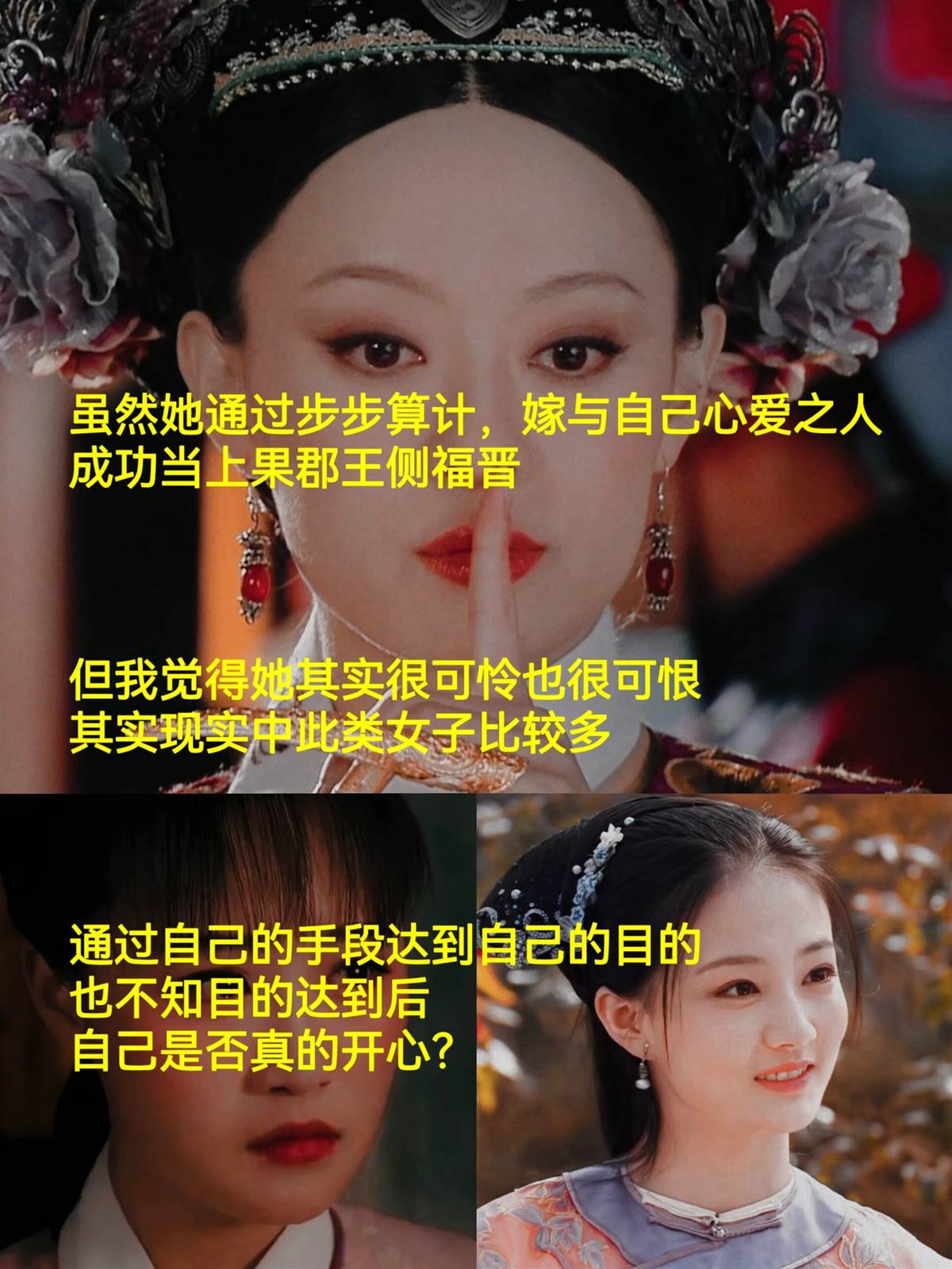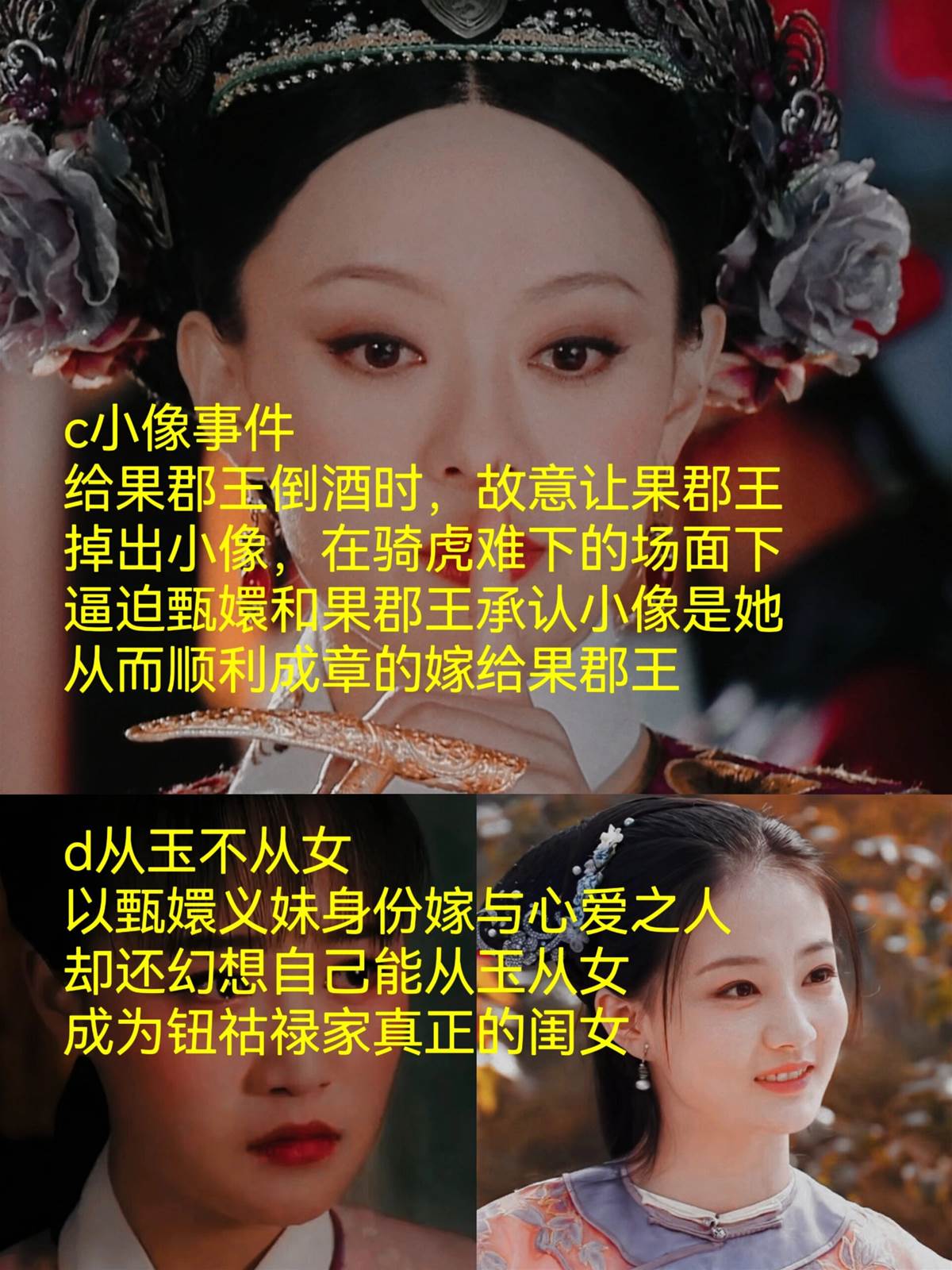 c小像事件‼️給果郡王倒酒時,故意讓果郡王掉出小像,在騎虎難下的場面下逼迫甄嬛和果郡王承認小像是她從而順利成章的嫁給果郡王d從玉不從女‼️以甄嬛義妹身份嫁與心愛之人卻還幻想自己能從玉從女成為鈕祜祿家真正的閨女雖然她通過步步算計,嫁與自己心愛之人成功當上果郡王側福晉但我覺得她其實很可憐也很可恨