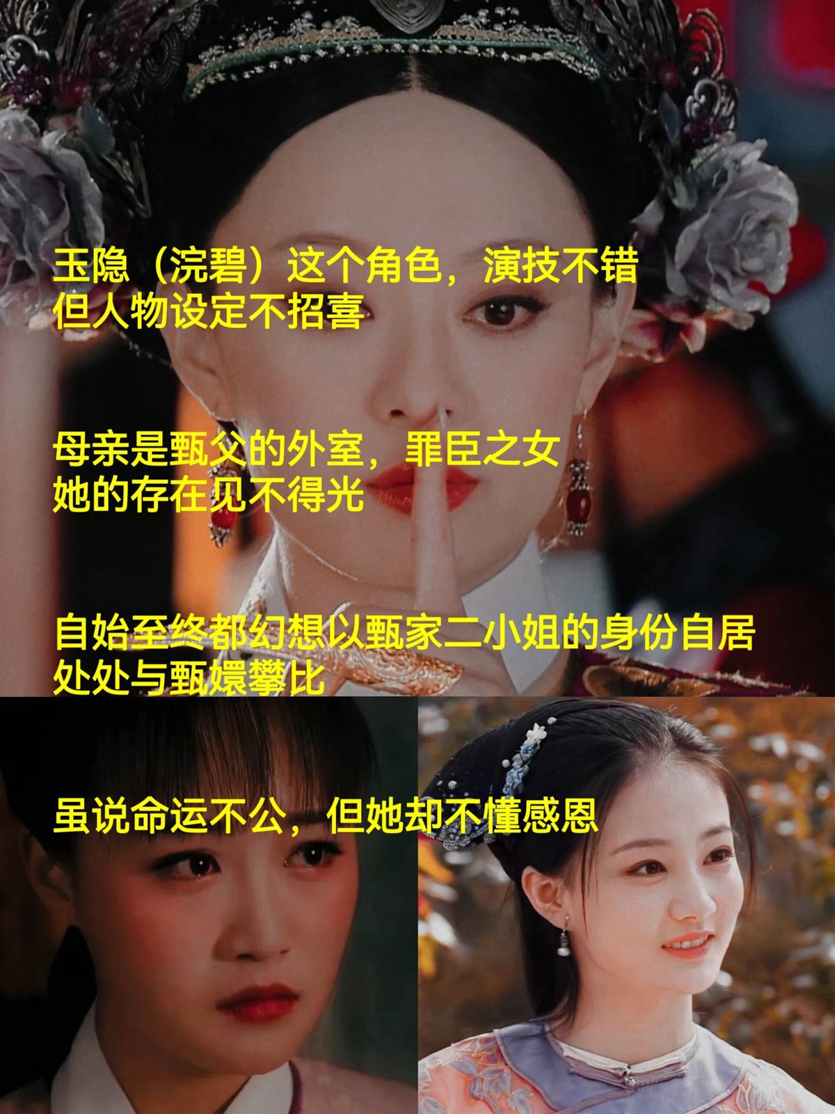 玉隱(浣碧)這個角色,演技不錯但人物設定不招喜母親是甄父的外室,罪臣之女她的存在見不得光自始至終都幻想以甄家二小姐的身份自居處處與甄嬛攀比雖說命運不公,但她卻不懂感恩