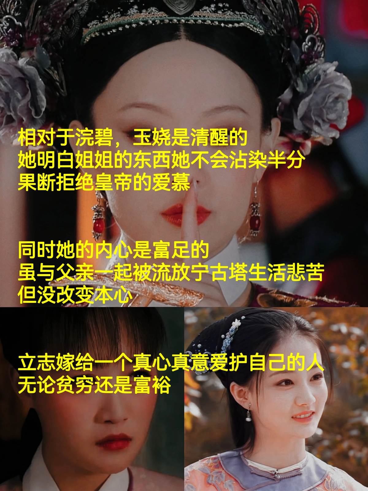 其實現實中此類女子比較多通過自己的手段達到自己的目的也不知目的達到后自己是否真的開心?相對于浣碧,玉嬈是清醒的她明白姐姐的東西她不會沾染半分果斷拒絕皇帝的愛慕同時她的內心是富足的