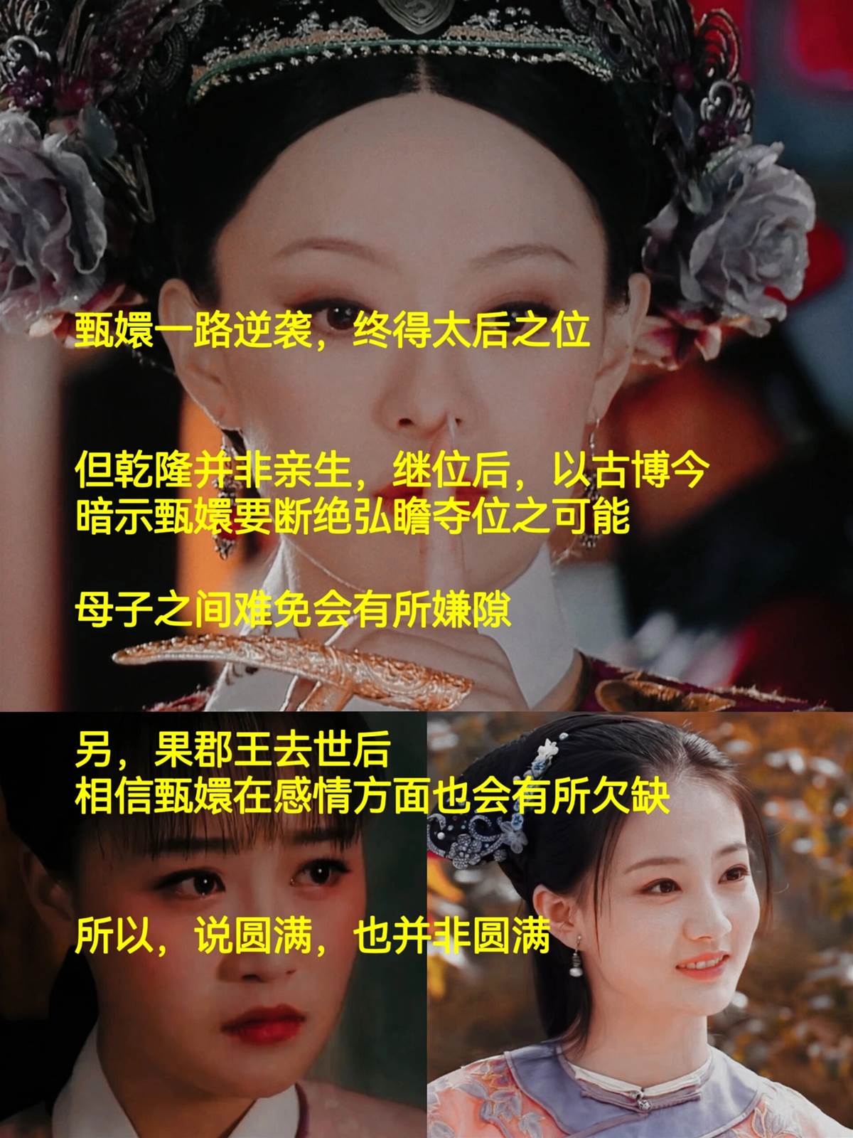 甄嬛一路逆襲,終得太后之位但乾隆并非親生,繼位后,以古博今暗示甄嬛要斷絕弘瞻奪位之可能母子之間難免會有所嫌隙另,果郡王去世后相信甄嬛在感情方面也會有所欠缺所以,說圓滿,也并非圓滿