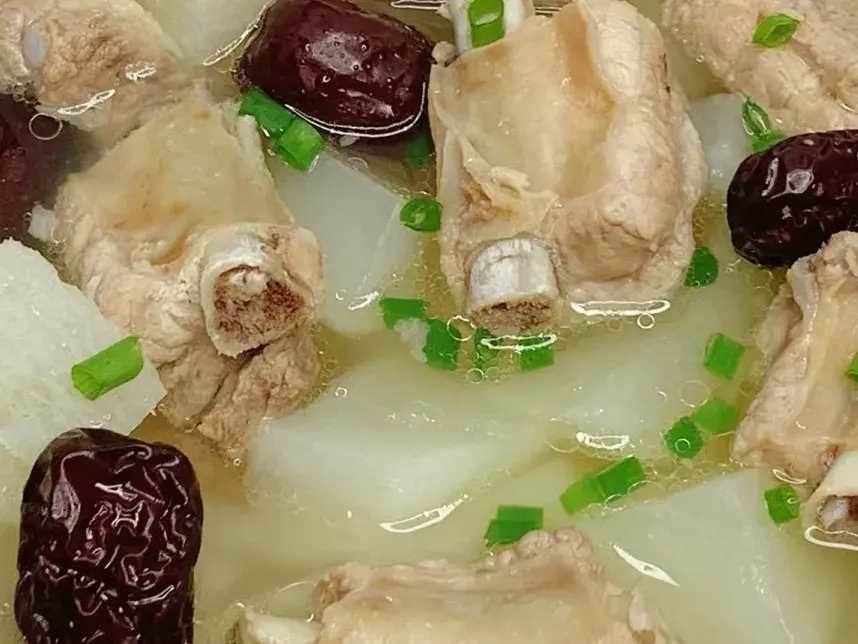 3、接著再放入白蘿卜和紅棗,繼續燉煮半個小時。最后撒上枸杞子,加入食鹽調味,煮至入味即可出鍋開吃。