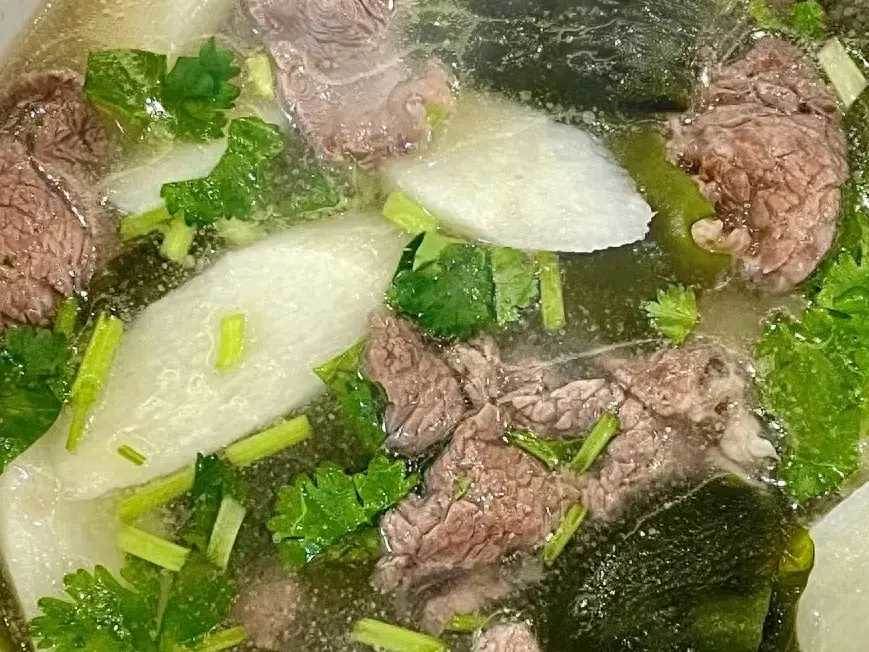 4、山藥煮熟后,放入裙帶菜煮兩分鐘。接著再放入牛肉煮至變色,加入食鹽和雞精調味,撒上香菜碎即可出鍋開吃。