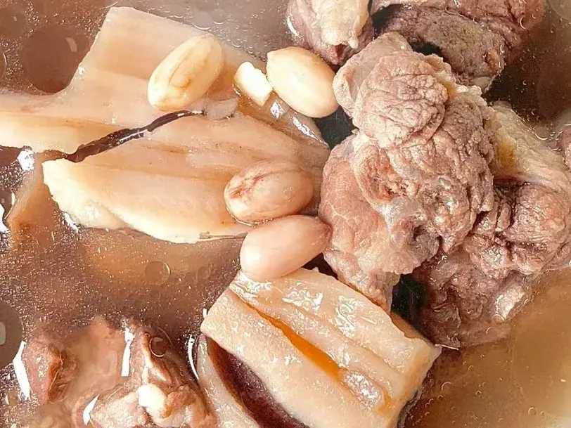 3、將豬骨、花生、蓮藕和姜片放入湯鍋中,放入清水蓋上蓋子,先開大火煮開,再轉小火煮一個小時。