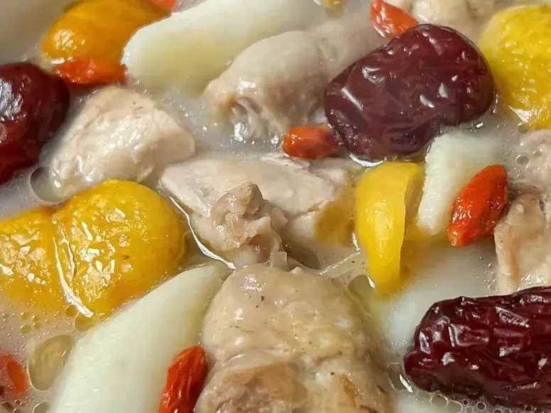 4、時間到,再放入山藥、板栗和紅棗,繼續燉煮半個小時。最后加入食鹽調味,撒上枸杞子即可出鍋開吃。