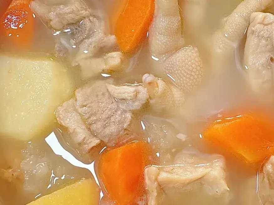 3、起鍋燒油,油熱后放入豬肺翻炒,炒至表面微黃,轉移倒入湯鍋中,再放入雞爪、排骨、無花果、雪梨干、胡蘿卜、馬蹄、姜片,加入足量的清水,燉煮一個半小時。