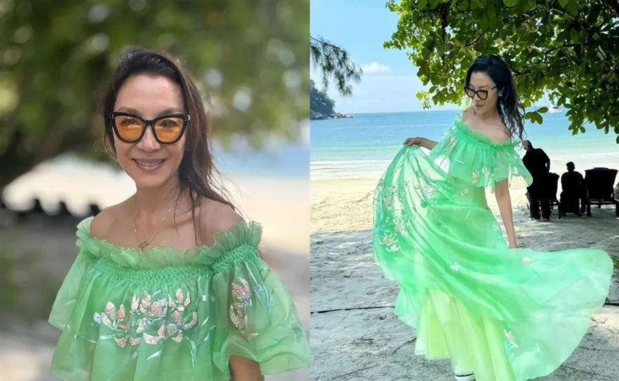 楊紫瓊午宴穿的是綠色露肩長裙,到了晚宴又換成了粉橙色系帶禮服,而這兩套禮服都是楊紫瓊的好友、夏姿陳的創始人陳彩霞為她專門設計的。