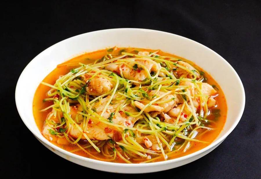 5、放入腌制好的魚片,輕輕晃動鍋,煮至魚片成熟,放入豌豆苗煮片刻即可,出鍋裝盤。
