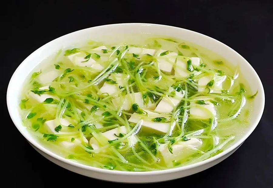 4、鍋中放入少許油,放入蔥姜炒香,倒入適量的清水煮沸,放入豆腐和豌豆苗大火煮片刻,最后放入少許鹽、雞粉、芝麻油即可,出鍋裝盤。