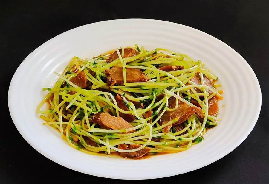 4、鍋中放入少許油,放入蔥姜蒜炒香,放入牛肉翻炒片刻,加入少許生抽、黃豆醬、油辣子翻炒均勻,放入豌豆苗翻炒片刻即可,出鍋裝盤。