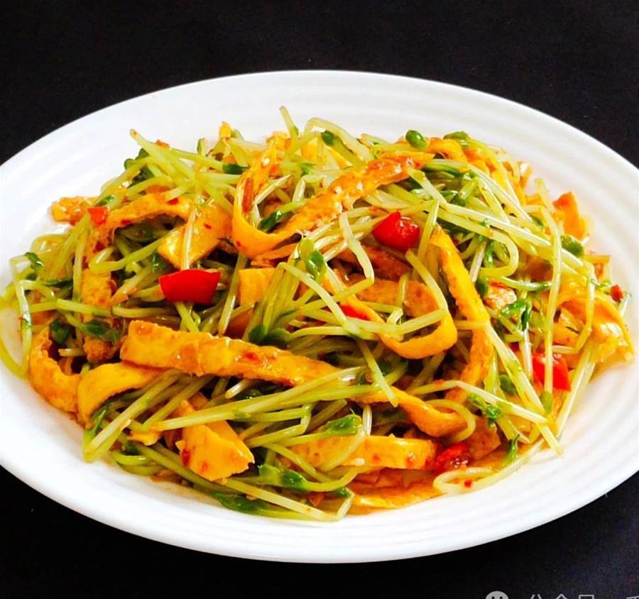 4、熱鍋涼油,倒入蛋液攤平,煎成蛋餅,出鍋放涼,切成蛋絲,放入豌豆苗上。