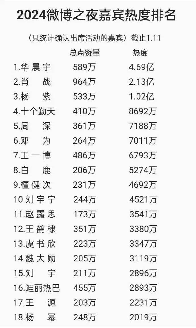 從網上出現的消息上看,有網友統計截止1月11日,確定出席的嘉賓熱度,從排名上看,我們可以看到華晨宇排在第一名,緊隨其后的是肖戰、楊紫、十個勤天、周深、鄧為等。