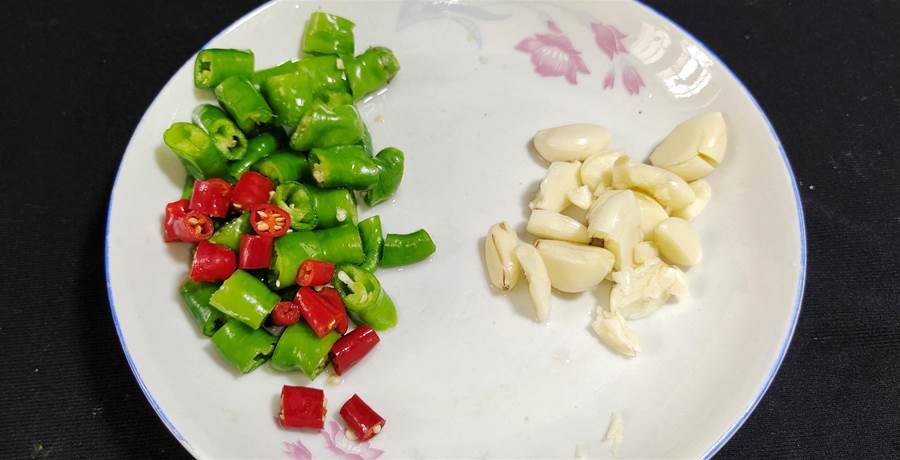 第五步:另起鍋燒油,加入大蒜粒以小火煎炒至焦黃色,而后加入青紅椒炒出香味。