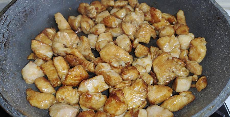 第四步:鍋里燒油,先把腌制好的雞丁下入油鍋中炒一炒,炒至完全變色后就可以盛出來控油待用。