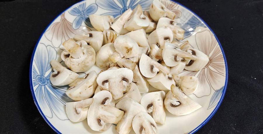 第一步:準備白蘑菇十幾二十個左右,小個的就直接對半剖開,個頭稍微大一點的就剖開成四份。而后開水下鍋焯燙十幾秒鐘后撈出控水待用。