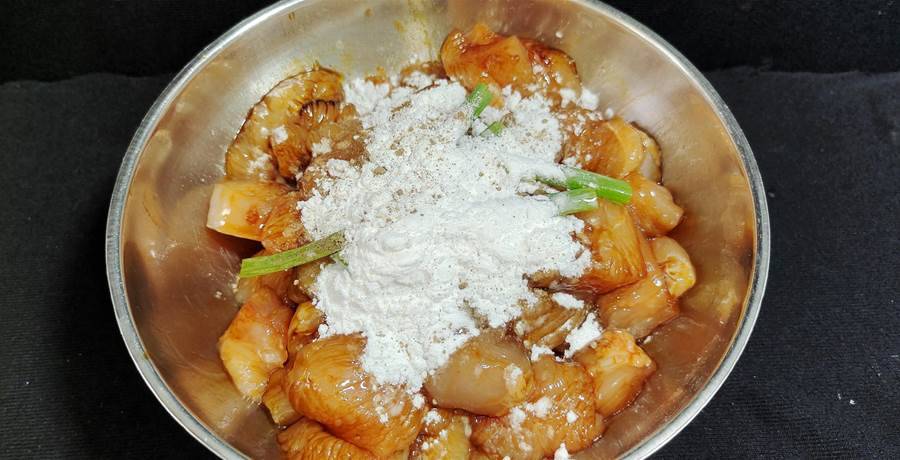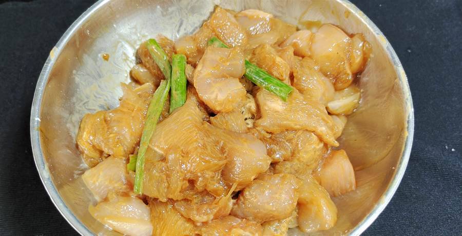 第二步:準備雞胸肉兩塊,洗干凈后切成厚片,再切成雞丁放入碗中,先加入食鹽,料酒,胡椒粉抓拌均勻,讓雞肉發粘一些。而后再加入生抽、老抽和一湯匙干淀粉充分地抓拌均勻,腌制20分鐘左右,怕肉炒老的可以加入少許小蘇打一塊腌制。