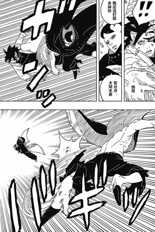 本話的最后,神樹復制體十羅與佐助復制人終于來到木葉,剛進村,川木就率隊對二人發起攻擊,然而雙方的實力差距實在太大,十羅僅用一擊就把川木打倒,從十羅淡定的表情不難發現,現在的他干掉川木簡直不費吹灰之力,只是因為某些原因還不能下手。可憐川木,開局兩連跪。