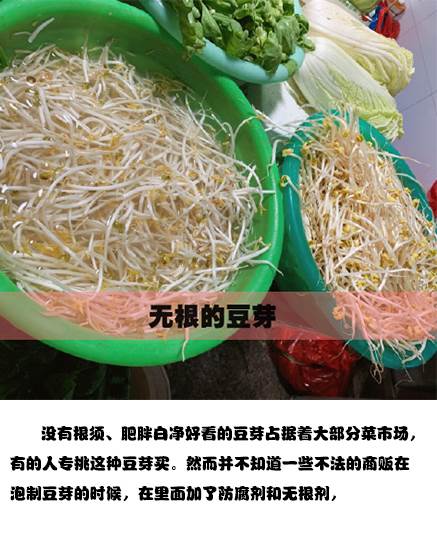沒有根須、肥胖白凈好看的豆芽占據著大部分菜市場,有的人專挑這種豆芽買。然而并不知道一些不法的商販在泡制豆芽的時候,在里面加了防腐劑和無根劑,這樣生產出的豆芽即大又好看,而且還能縮短泡制的時間,但是這種豆芽添加劑太多,對身體是不好的,所以見到無根豆芽,果斷拒絕!