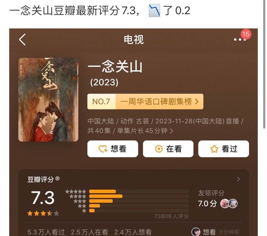 目前《一念關山》的豆瓣評分相比較最初已經下降了0.2,網友們對于女主角人設的改變有很多的不滿,而且有部分觀眾覺得關于這部劇戲外的爭議有很多,這也大大的影響了大家追劇的體驗。