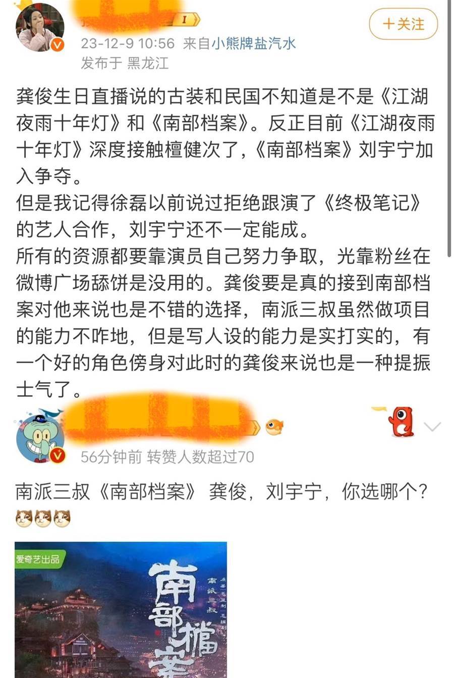 在這件事發酵的過程中,有網友還扒出了之前劉宇寧與龔俊合作的時候,當時似乎也有男配和男主之間的爭議。
