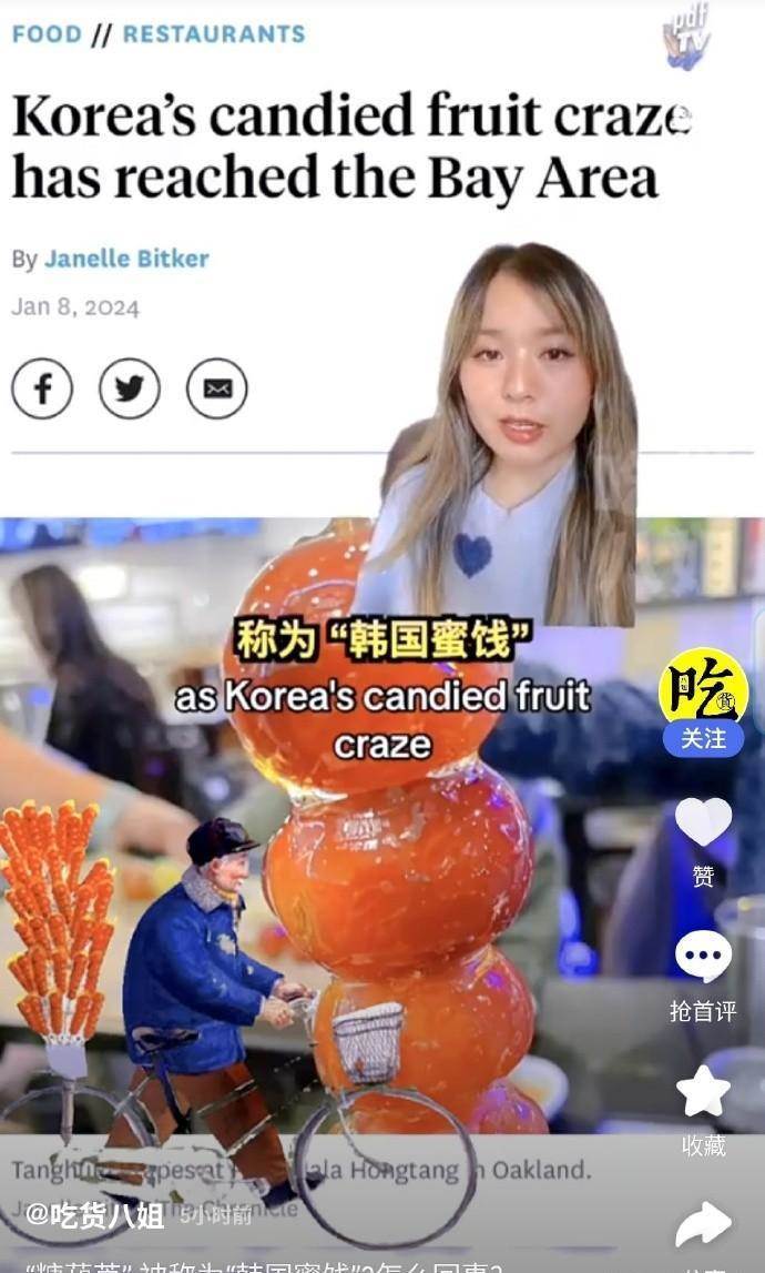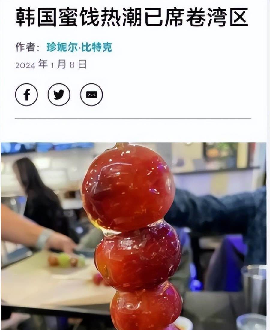 還有近幾月在韓國爆火的中國糖葫蘆,韓國也試圖開始偷了,當時就有網友擔憂韓國會偷,果不其然,舊金山媒體直接用「韓國蜜餞」報道,也是十分可笑。