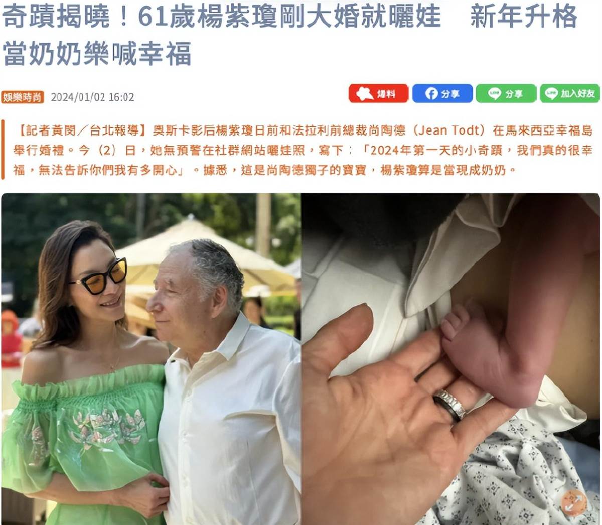 事情的起因是这样的,几天前杨紫琼通过社交账号晒出了一张照片,镜头中的杨紫琼张开左手,手上还握着一只婴儿的脚踝,通过画面不难辨认,照片中的宝宝应该刚出生没多久,皮肤都还是紫红色,而这张照片曝光后,很快也引起了网友热议。