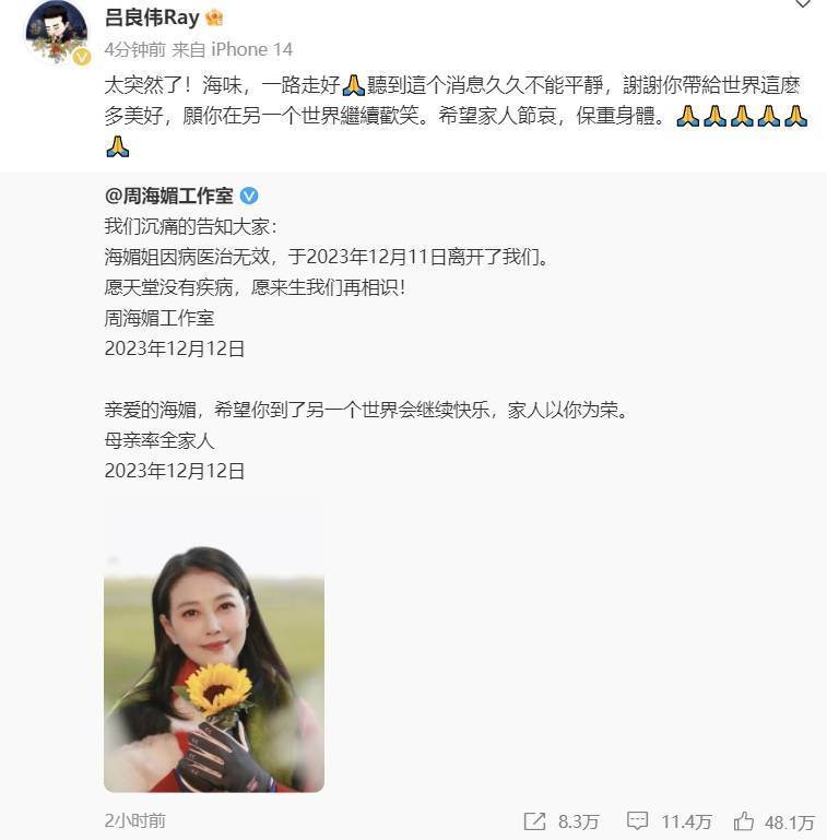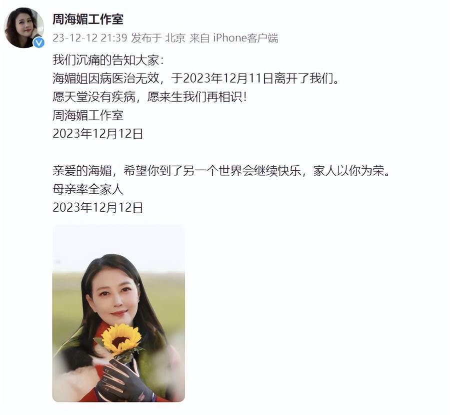 官方賬號發文中,包括兩段文字。其一為周海媚工作室所發,「我們沉痛地告知大家:海媚姐因病醫治無效,于2023年12月11日離開了我們。愿天堂沒有疾病,愿來生我們再相識!」