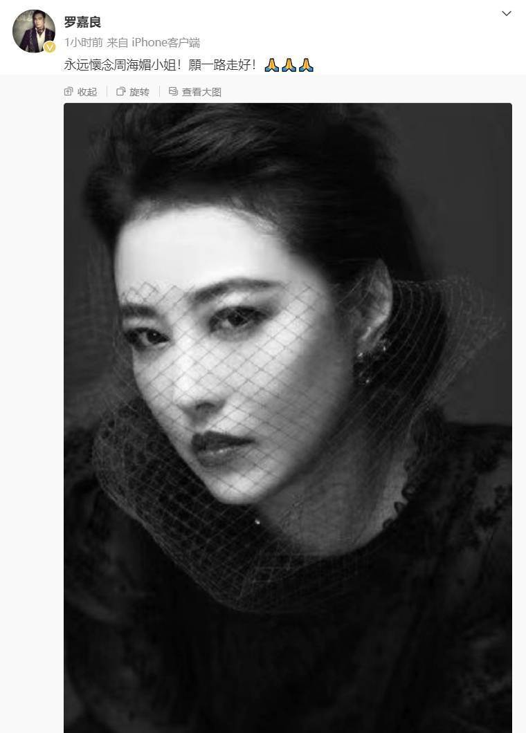 曾與周海媚在《情濃大地》和《天地豪情》兩部劇中有過合作的演員羅嘉良深夜發文:「永遠懷念周海媚小姐,愿一路走好」