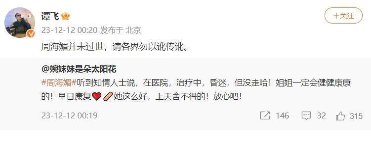 倒是當天晚些時候,著名編劇譚飛他轉發了一則自稱來自「知情人」的消息代為辟謠,稱周海媚并未去世,請大家勿以訛傳訛。文中透露,周海媚在醫院治療中,處于昏迷狀態,也有消息稱,周海媚是因為血小板偏低后昏迷,經過搶救后已經脫離危險。只是,粉絲們翹首以盼了一天,最終等來的卻仍是噩耗。
