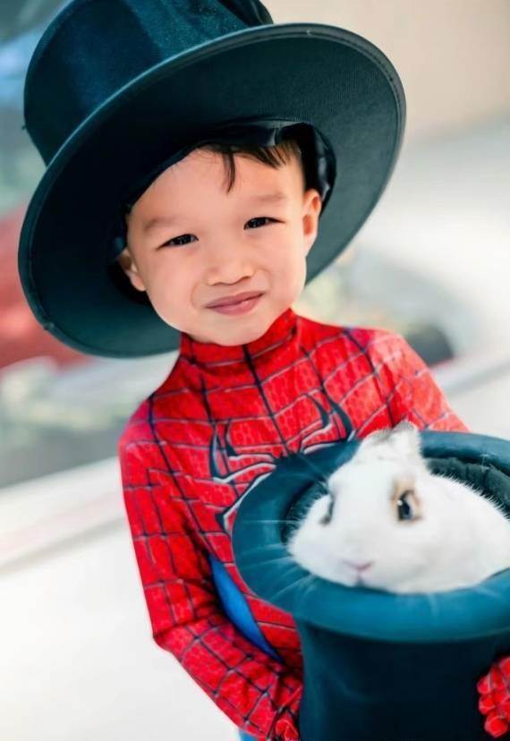 奕宏戴著大大的帽子,穿著可可【愛☆愛】的蜘蛛俠衣服,手里還捧著一只小白兔,看來是玩魔術時的「道具」哦。小家伙看著鏡頭笑瞇了眼。這副模樣,確實和媽媽胡杏兒好像,妥妥地mini版杏兒有沒有。