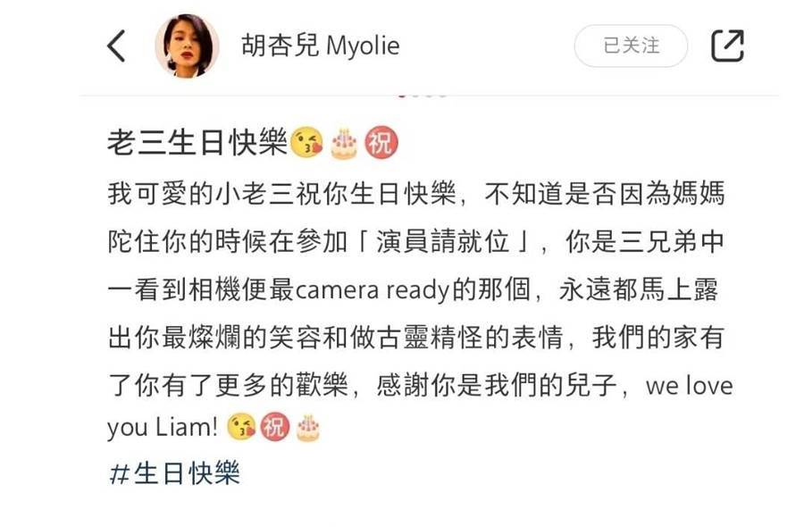 4月4日凌晨,演員胡杏兒在個人社交平台分享了一組為小兒子奕宏慶祝三歲生日的照片她還幸福發文:「老三生日快樂」。胡杏兒稱小兒子奕宏的鏡頭感非常好,她笑稱不知道是不是懷小家伙的時候參加了演員相關的節目,只要看到鏡頭,奕宏立馬就露出最燦爛的笑容和做古靈精怪的表情。沒想到咱們的小奕宏如此有表現欲呀,不知道未來會不會走上和媽媽一樣的演員路呢。文末,胡杏兒再度祝兒子生日快樂,她寫道:「我們家有了你有了更多的快樂,感謝你是我們的兒子,we love you Liam」。