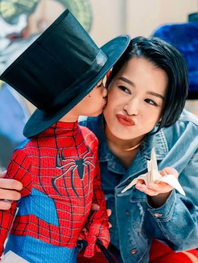 和哥哥們同框之后,奕宏當然不會錯過和媽媽一起秀幸福啦。下圖里,胡杏兒蹲在地上,一手摟著兒子,一手拿著千紙鶴,她嘟著紅唇接受來自兒子的香吻,老母親開心到飛起。小奕宏此刻則完全沉浸在了親媽媽臉蛋兒,因此并沒有看著鏡頭。