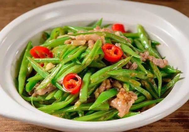 4、鍋里倒入食用油,下入辣椒,生姜炒香,加入扁豆絲翻炒5成熟,加入肉,食鹽,生抽翻炒至熟裝盤即可。