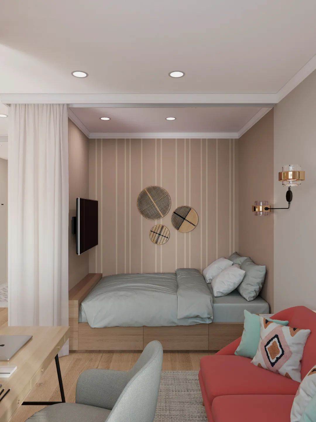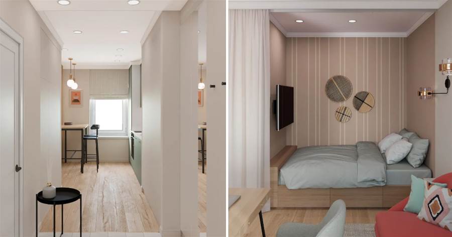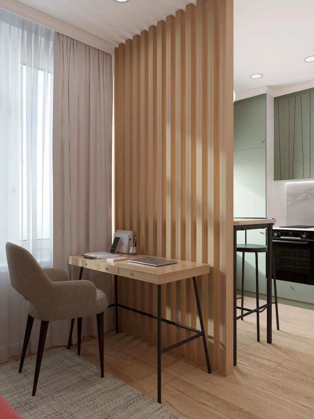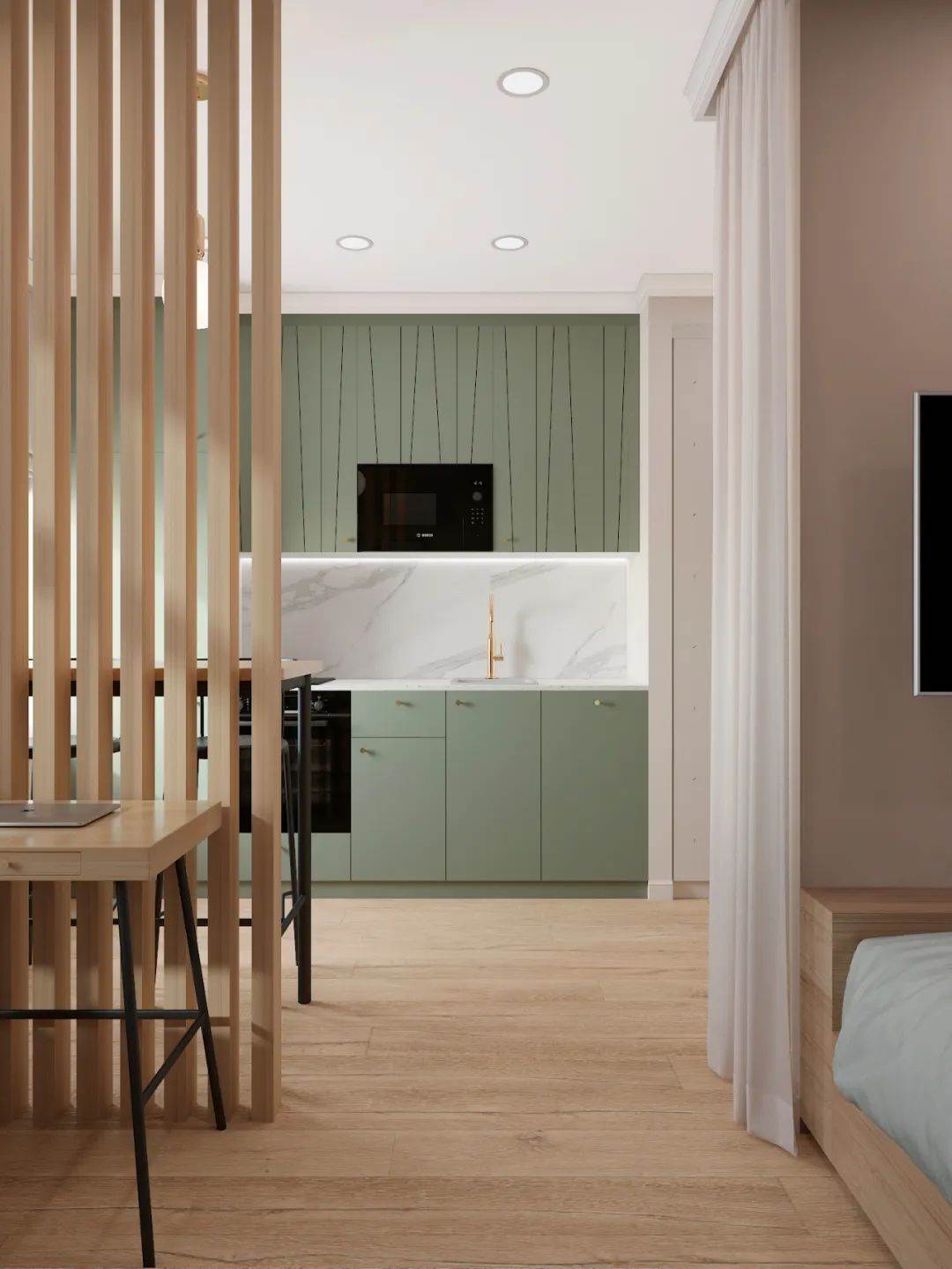 廚房和客廳區域由板條隔板隔開,床被放置在窗簾后面的壁龕里。這個公寓的一個很大優勢是,進入它時,視野不是聚焦在墻上,而是聚焦在窗戶上,可以視覺上擴大空間。