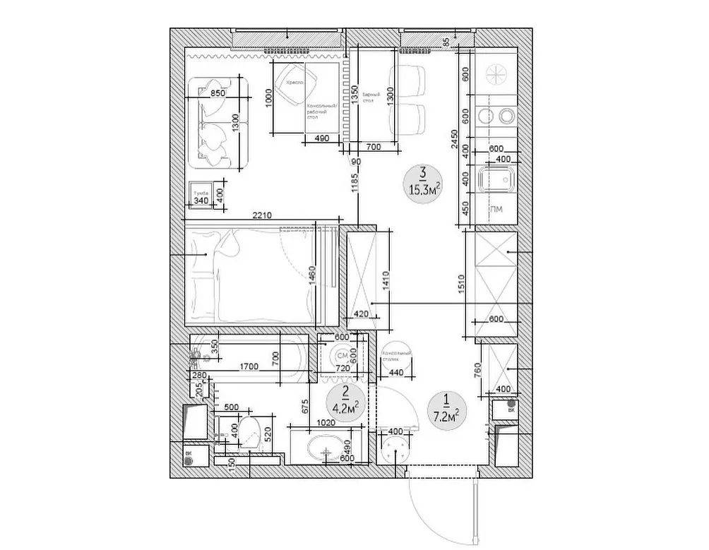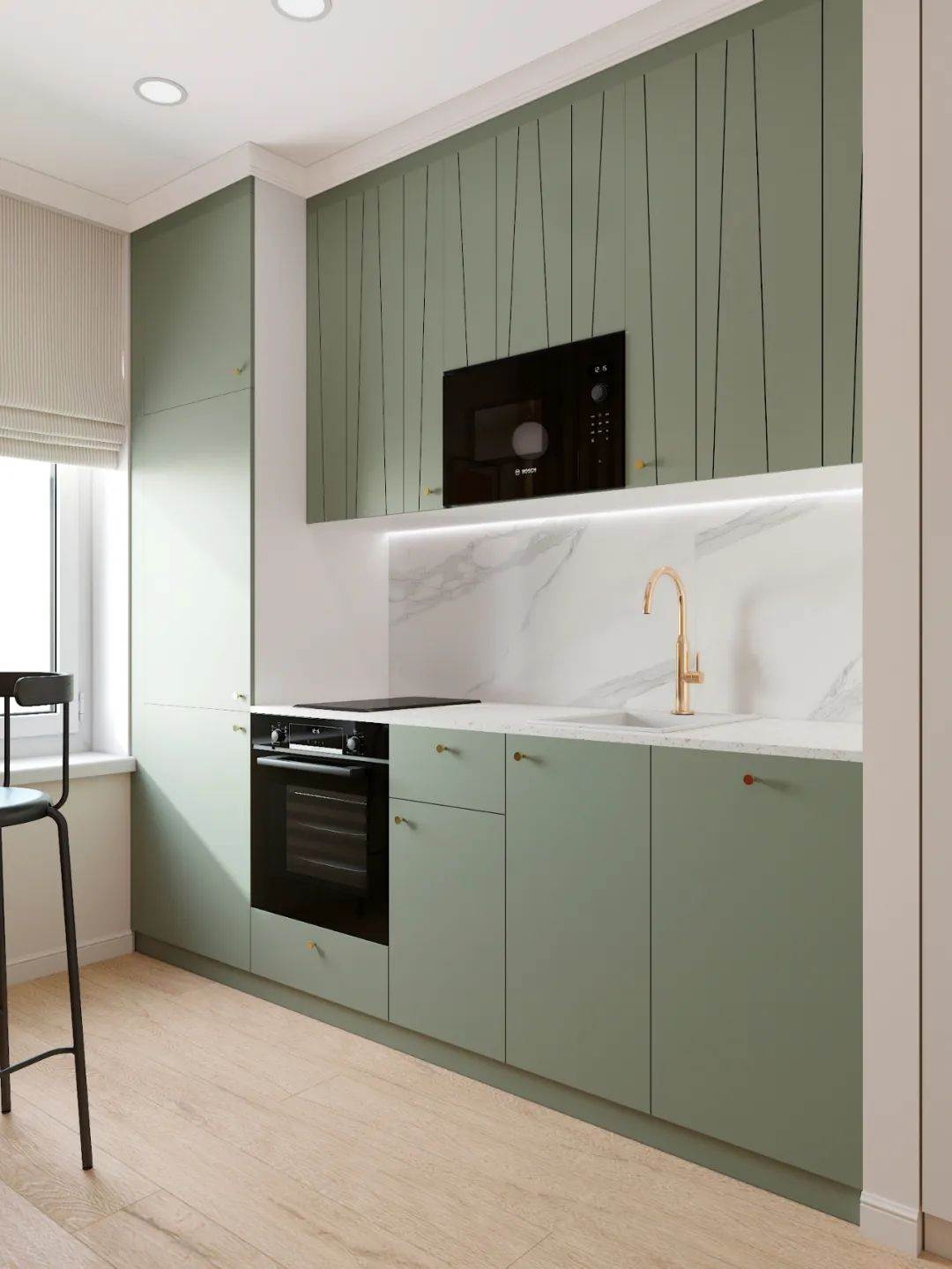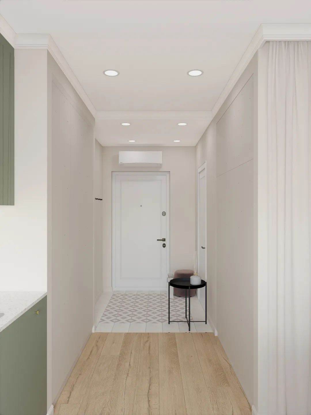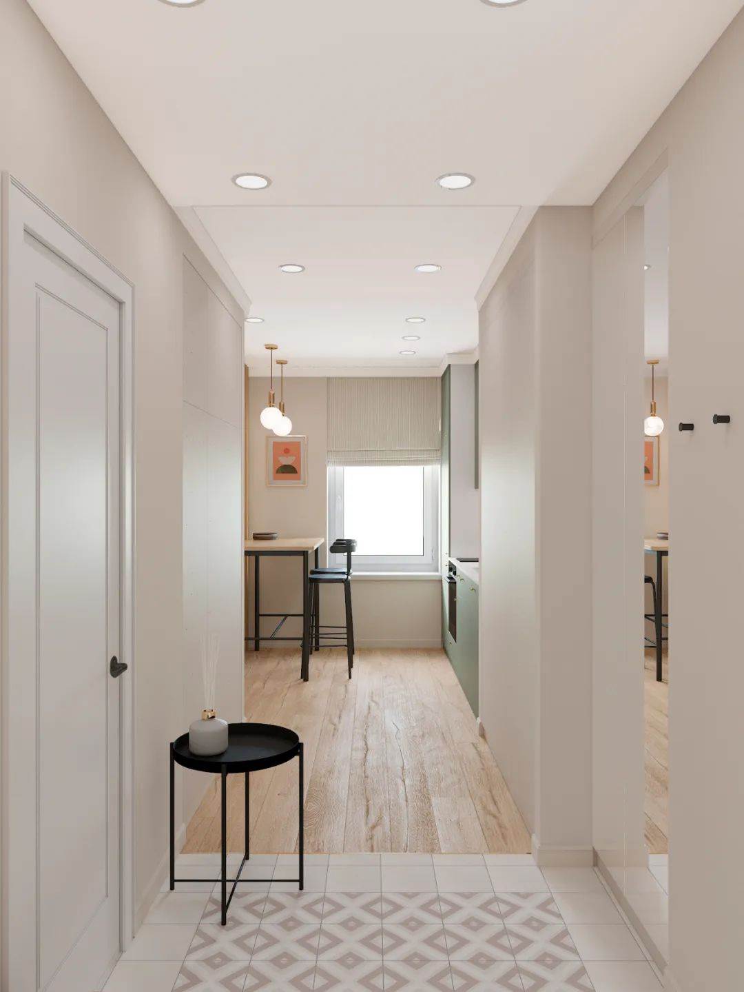 廚房和客廳區域由板條隔板隔開,床被放置在窗簾后面的壁龕里。這個公寓的一個很大優勢是,進入它時,視野不是聚焦在墻上,而是聚焦在窗戶上,可以視覺上擴大空間。