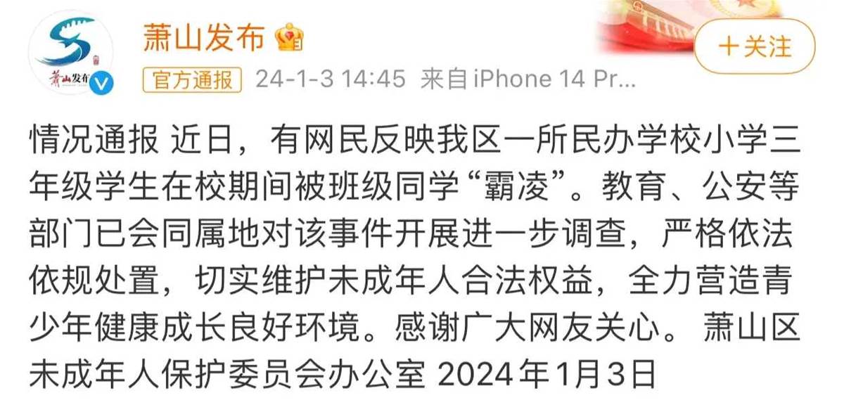 郝邵文妻子發長文痛訴,自己8歲的女兒在杭州某學校遭遇校園霸凌,很長一段時間。每晚女兒都會做噩夢哭醒,雖然已經和學校溝通,但學校處理的方式很可惡,給女兒造成了二次傷害,竟然用「只是朋友間的一種游戲」來回復。