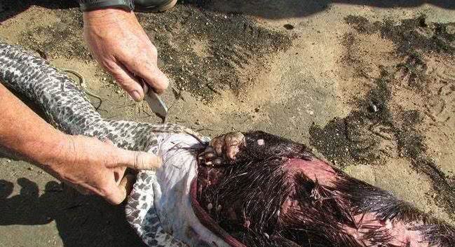 國外在路邊有人看見了一條蟒蛇尸體,肚子中間鼓起一大包,不知道吞食了什麼。好奇之下發現的人對蛇進行了解剖,剖開蛇的肚子一看,現場的人無不驚呆了,蟒蛇竟然吞食了一只豪豬!