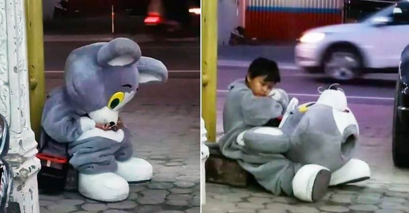 根據外媒Serembinews報導,影片中穿著布偶裝蹲坐在路邊的小男孩,是一位年僅9歲、名叫Rehan的小朋友。由于他的家境並不富裕,因此為了協助相依為命的媽媽負擔龐大的生活費,每天早上天都還沒亮,就都得穿著厚重的玩偶服出門工作!