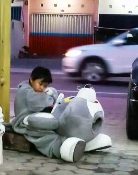 Rehan幾乎每天都得一大清早就背著厚重的玩偶服,到距離家裡長達10公里路程的Kalimantan Selatan的Jalan Gatot Subroto附近,向行經的用路人與小朋友手舞足蹈、傳遞滿滿的療癒正面力量,但誰又曾想過躲在玩偶裡賣命逗樂大家的人,卻還只是一位年僅9歲的小朋友...