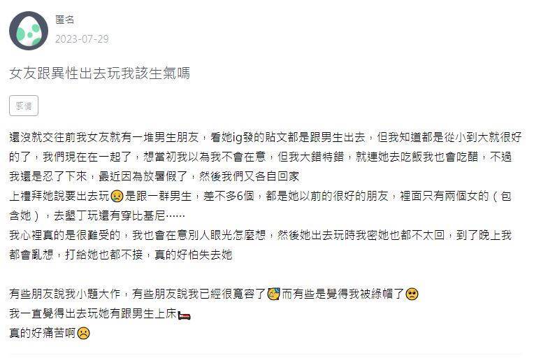 男網友在《Zuvio 校園》抱怨:「女友跟異性出去玩我該生氣嗎?」其實交往前,原PO已經知道女友常和「從小到大就很好的」男生友人出門,女友Instagram貼文也一堆男生朋友。本來以為自己肚裡能撐船,未料是原PO高估自己,只要女友跟異性出門,就算是吃飯他也會吃醋,「不過我還是忍了下來」。