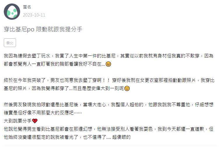 未料男友看了她穿比基尼的動態後,怒批原PO不尊重他,甚至爆氣提分手,「他說他覺得男生看到比基尼都會在那邊幻想,他無法接受別人看著我耍//色」。