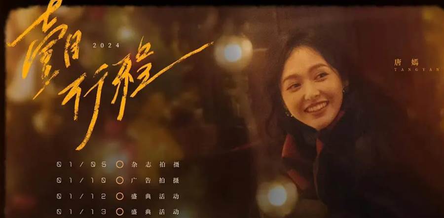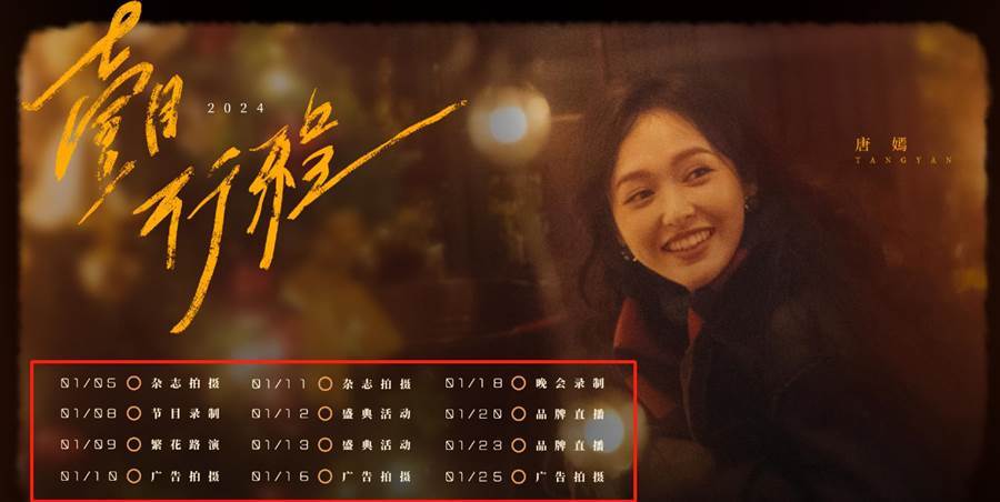 當然,網絡評價不具備全部參考價值,最直觀的還是商業地位。有眼尖的網友發現,《繁花》剛播出時唐嫣的一月行程圖只有寥寥五個,其中包括商業拍攝和時尚活動。
