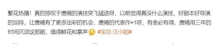 還有網友表示,以前覺得唐嫣沒什麼演技,但這次碰上好導演和好劇本,演技算是突飛猛進。如此看來,她之前花了三年時間去拍這部劇,真是應了那句話:「有舍必有得!」