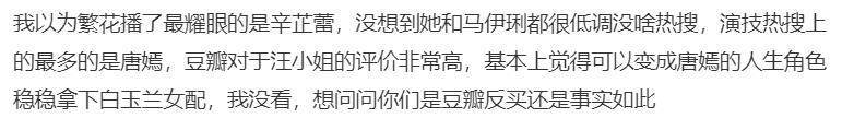 不少看過的觀眾表示,這部劇剛播出的時候,本以為辛芷蕾和馬伊琍會是最大的討論點,沒想到最后反而是唐嫣先有熱度。甚至還有不少人押寶,明年的「白玉蘭」最佳女配角會被她拿下。
