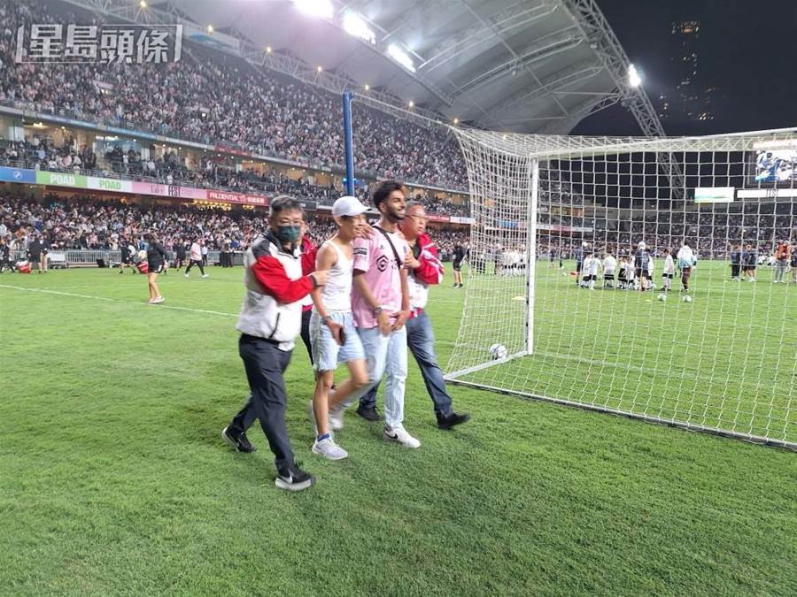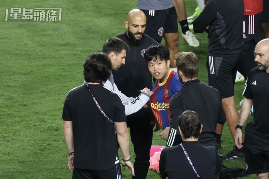 昨日(3日)在香港大球場公開操練,備戰(4日)與港隊進行表演賽,有兩位香港瘋狂球迷突破封鎖沖入場內,其中一位跑到梅西身邊成功拿到簽名,隨即被大批安保攆下場。
