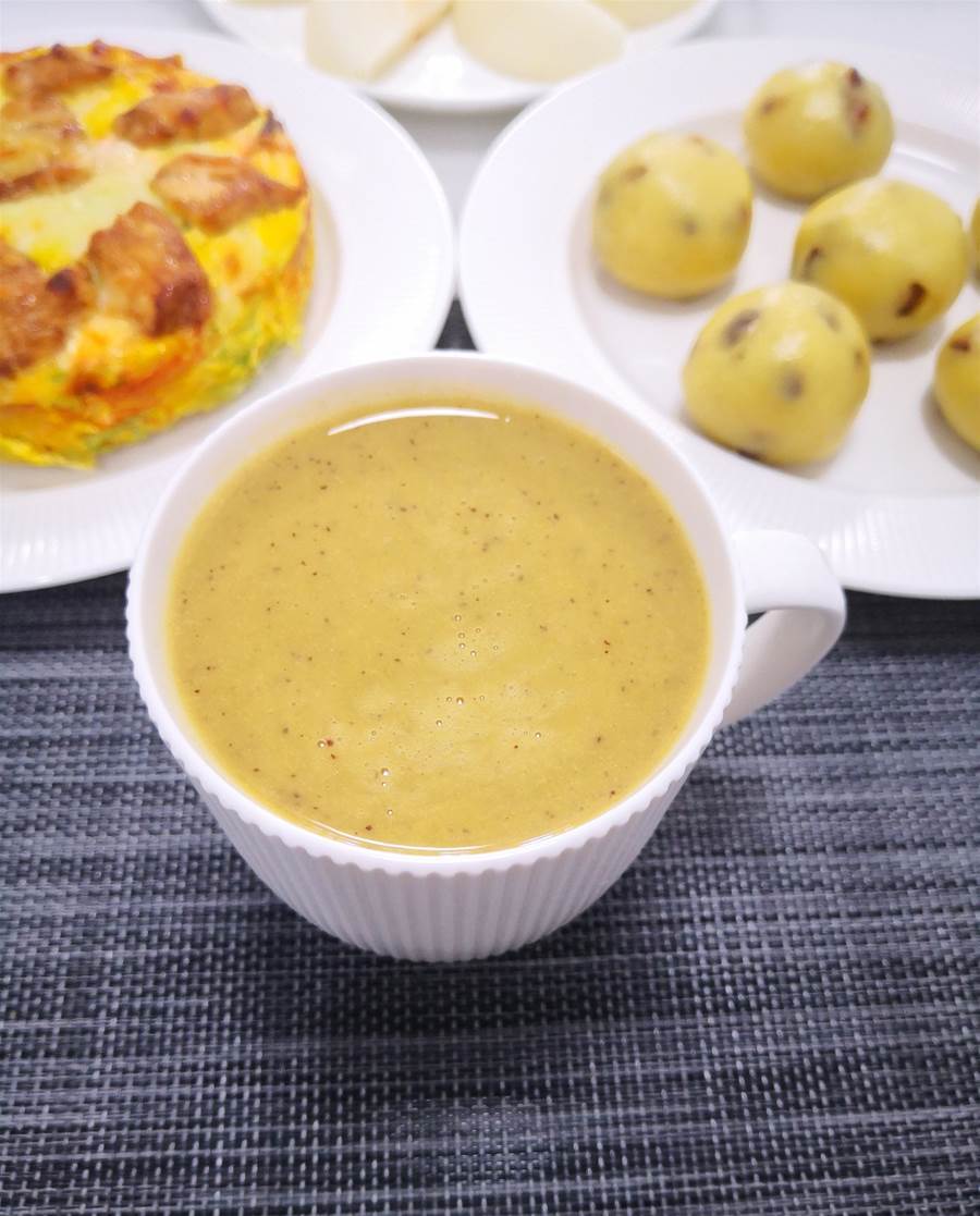 早餐干稀搭配更合理,黃豆26克,綠豆20克,洗凈后加水浸泡一夜,枸杞6克,紅棗3個,山藥去皮后約15克,加水至750~800毫升處,選擇豆漿模式即可,口感絲滑香甜,常喝對養肝護肝、健脾養胃、增強免疫力等都有幫助。