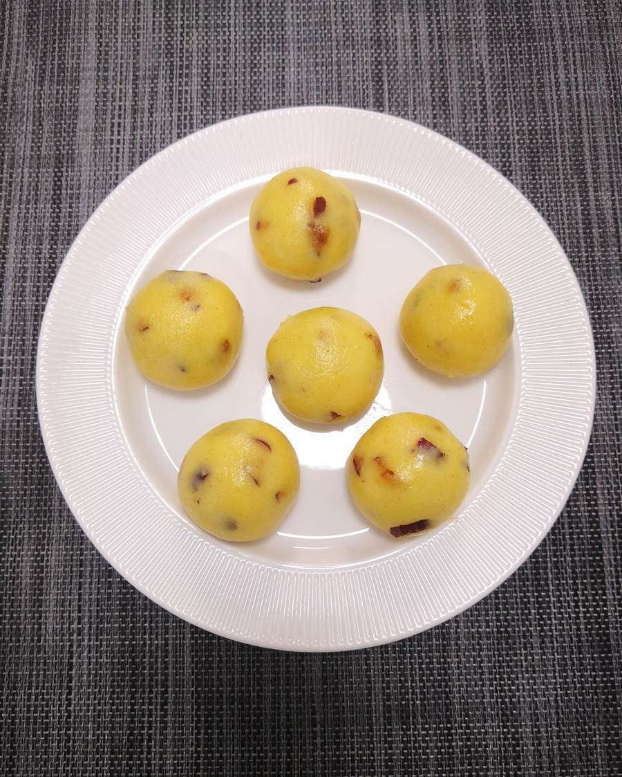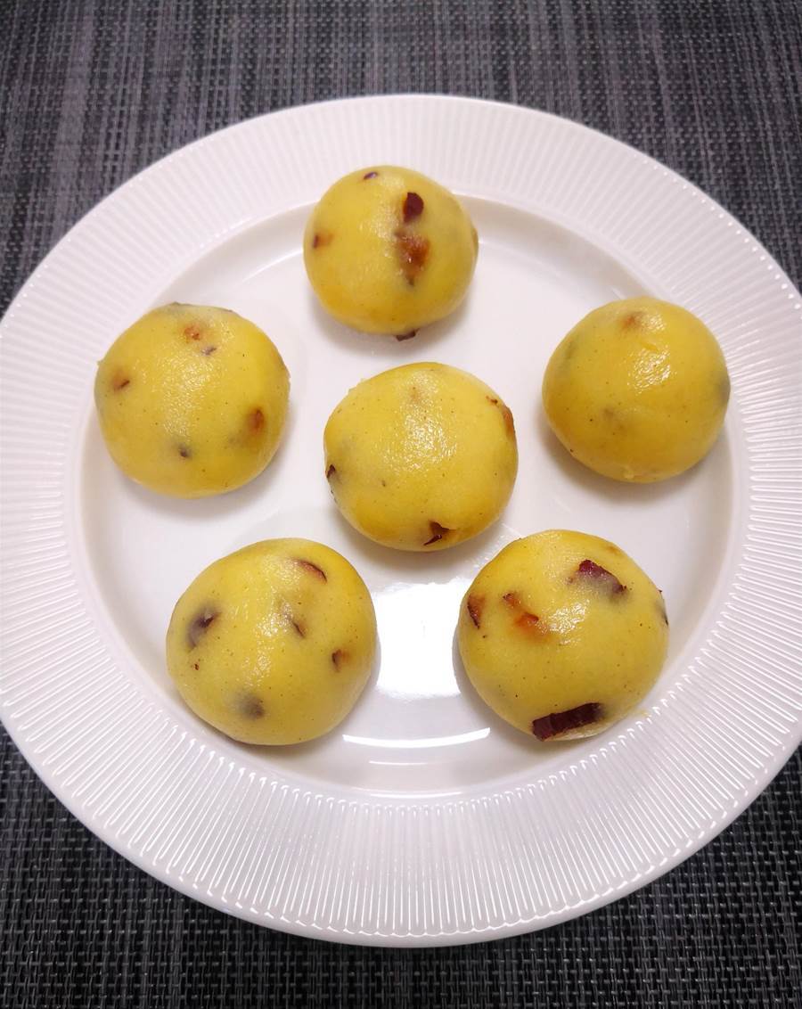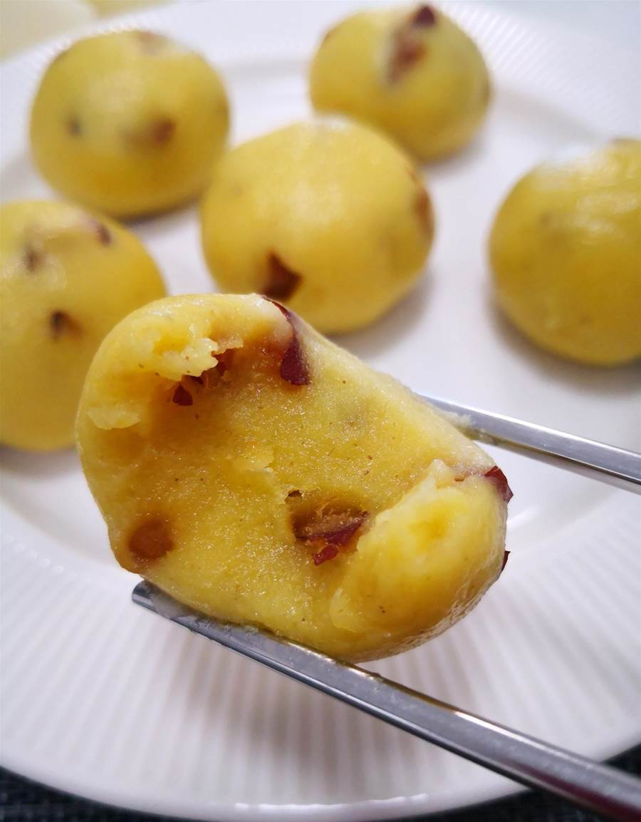 做法:大黃米面里面加點紅棗碎,用約60度的熱水和面,水量以能搓成光滑的圓球就可以,冷水上鍋,開大火蒸約25分鐘,關火后燜兩三分鐘即可。