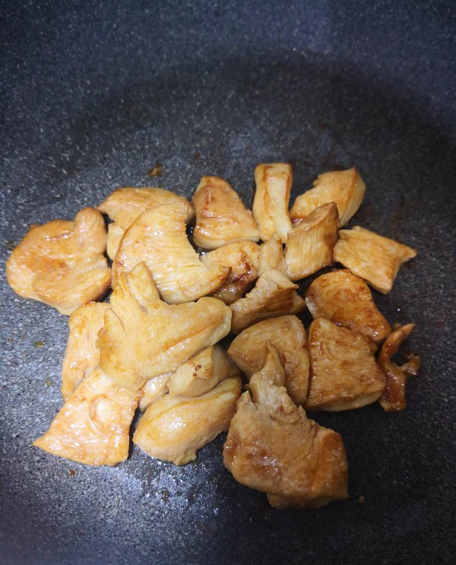 平底鍋加少許油,倒入腌制好的雞肉,翻炒至肉變色盛出晾晾。